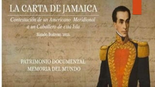 El documento presenta información sobre tres importantes documentos de Simón Bolívar: el Discurso de Angostura, la Carta de Jamaica y la Carta de Pativilca. En el Discurso de Angostura, Bolívar establece las bases para la nueva constitución venezolana, incluyendo la igualdad social y la división tradicional de poderes. En la Carta de Jamaica, Bolívar argumenta que España no puede mantener su dominio sobre América y señala los aspectos negativos de la colonización. Finalmente, en la Carta de Pativilca,