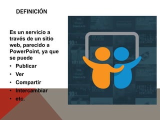 El documento describe cómo utilizar un servicio web similar a PowerPoint, donde los usuarios pueden registrarse, subir y compartir presentaciones. El proceso de registro incluye completar un formulario y, tras iniciar sesión, los usuarios pueden cargar sus archivos de presentación. Al finalizar la carga, es necesario proporcionar un título, una descripción y palabras clave antes de publicar la presentación.