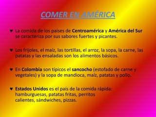 Este documento resume los alimentos y platos típicos de diferentes regiones del mundo. Brevemente describe las características de la comida en Centroamérica, Estados Unidos, Europa, Asia, África y Oceanía, incluyendo ejemplos como el sancocho colombiano, las hamburguesas estadounidenses, el kabsah saudí y el pescado japonés. También presenta información sobre productos como el queso parmesano, las alcaparras, el vino chileno y los cereales.