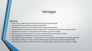 Slideshare permite compartir presentaciones en línea de manera fácil. Ofrece ventajas como permitir dar conferencias sin necesidad de cargar la presentación en cada computadora y facilitar el compartir presentaciones con colegas. Algunas desventajas son que los formatos en PowerPoint son limitados sin un presentador, y a veces hay incompatibilidad de formatos al subirlas.