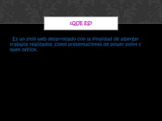 SlideShare es un sitio web que permite a usuarios publicar y compartir presentaciones en línea como PowerPoint y OpenOffice. Los usuarios pueden crear una cuenta en SlideShare, cargar sus presentaciones, agregar etiquetas, y luego publicarlas y compartirlas fácilmente a través de enlaces o redes sociales. SlideShare funciona como un repositorio en línea para presentaciones y permite a los usuarios encontrar y ver presentaciones de otros usuarios.