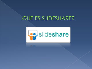 SlideShare es un sitio web que permite a los usuarios subir y compartir presentaciones de diapositivas y documentos de forma gratuita y pública o privada. Los usuarios pueden acceder al servicio de alojamiento gratuito registrándose o usando su cuenta de Facebook.
