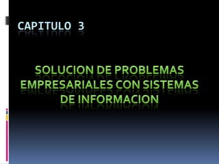 El documento describe el enfoque sistémico para la solución de problemas. Este enfoque incluye los pasos de reconocer y definir el problema, desarrollar y evaluar soluciones alternativas, seleccionar la mejor solución, y diseñar e implementar la solución seleccionada. También describe el análisis organizacional, del sistema actual y de requerimientos funcionales como parte del proceso de solución de problemas.