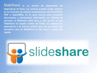 SlideShare es un servicio en línea para compartir presentaciones en formato PowerPoint, PDF u OpenOffice. Los usuarios pueden crear una cuenta gratuita para cargar archivos de hasta 100MB y SlideShare los convierte a formato flash para que puedan verse como diapositivas o en pantalla completa. El servicio permite compartir fácilmente presentaciones con otros y es similar a YouTube pero diseñado específicamente para presentaciones.