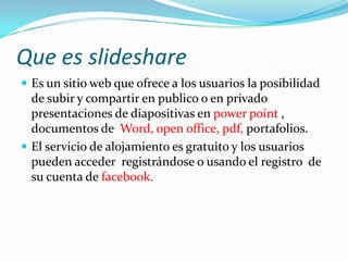 Slideshare es un sitio web que permite a los usuarios subir y compartir presentaciones, documentos y portafolios de manera gratuita. Para acceder, los usuarios deben registrarse con una cuenta de correo electrónico y luego iniciar sesión en slideshare.net. Una vez dentro, pueden subir archivos haciendo clic en "upload", seleccionando el archivo que desean compartir.
