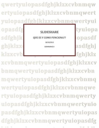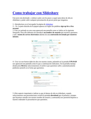 Este documento proporciona instrucciones sobre cómo registrarse y publicar presentaciones en SlideShare. Explica los pasos para crear una cuenta, subir presentaciones y descargar presentaciones de otros usuarios. También resume algunas características clave de SlideShare como el almacenamiento de archivos de hasta 20MB, la conversión a formato flash, la búsqueda y comentarios de presentaciones y la posibilidad de incrustar presentaciones en páginas web.