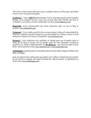 Este documento menciona varias aplicaciones web que pueden usarse junto con un blog para mejorar su alcance y análisis, incluyendo Feedburner para generar RSS, Blogarithm para envíos de correo electrónico automáticos, Technorati para integrar el blog en la blogosfera general, y Sitemeter y My Blog Log para estadísticas y análisis de tráfico del blog. También menciona que Audioblogger permite publicar entradas de audio en blogs desde teléfonos.