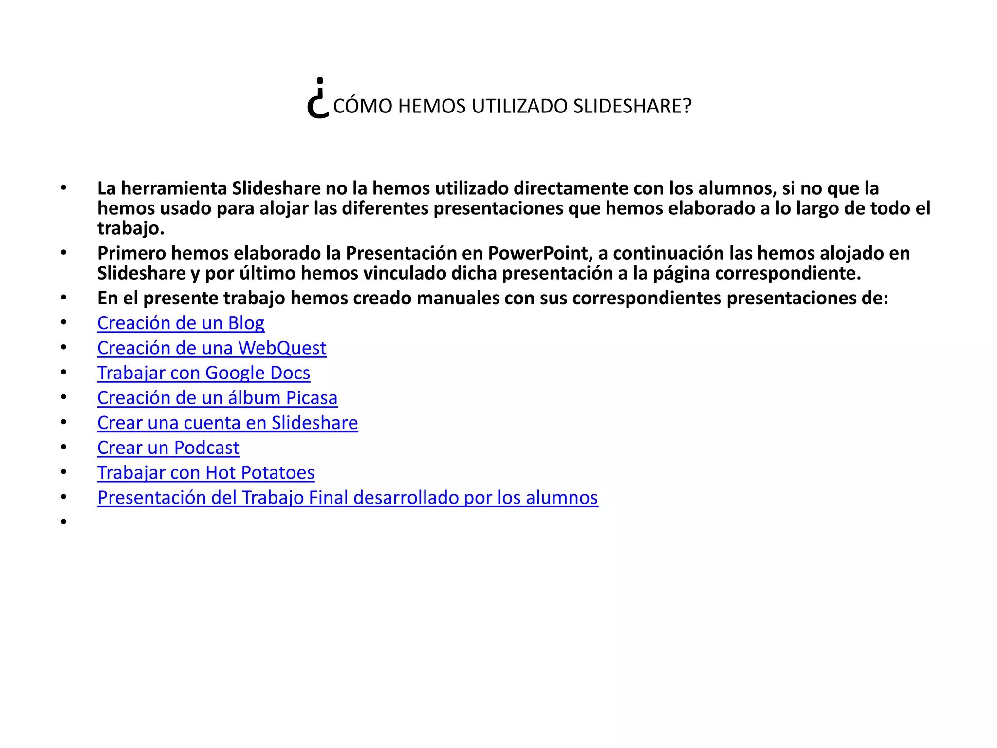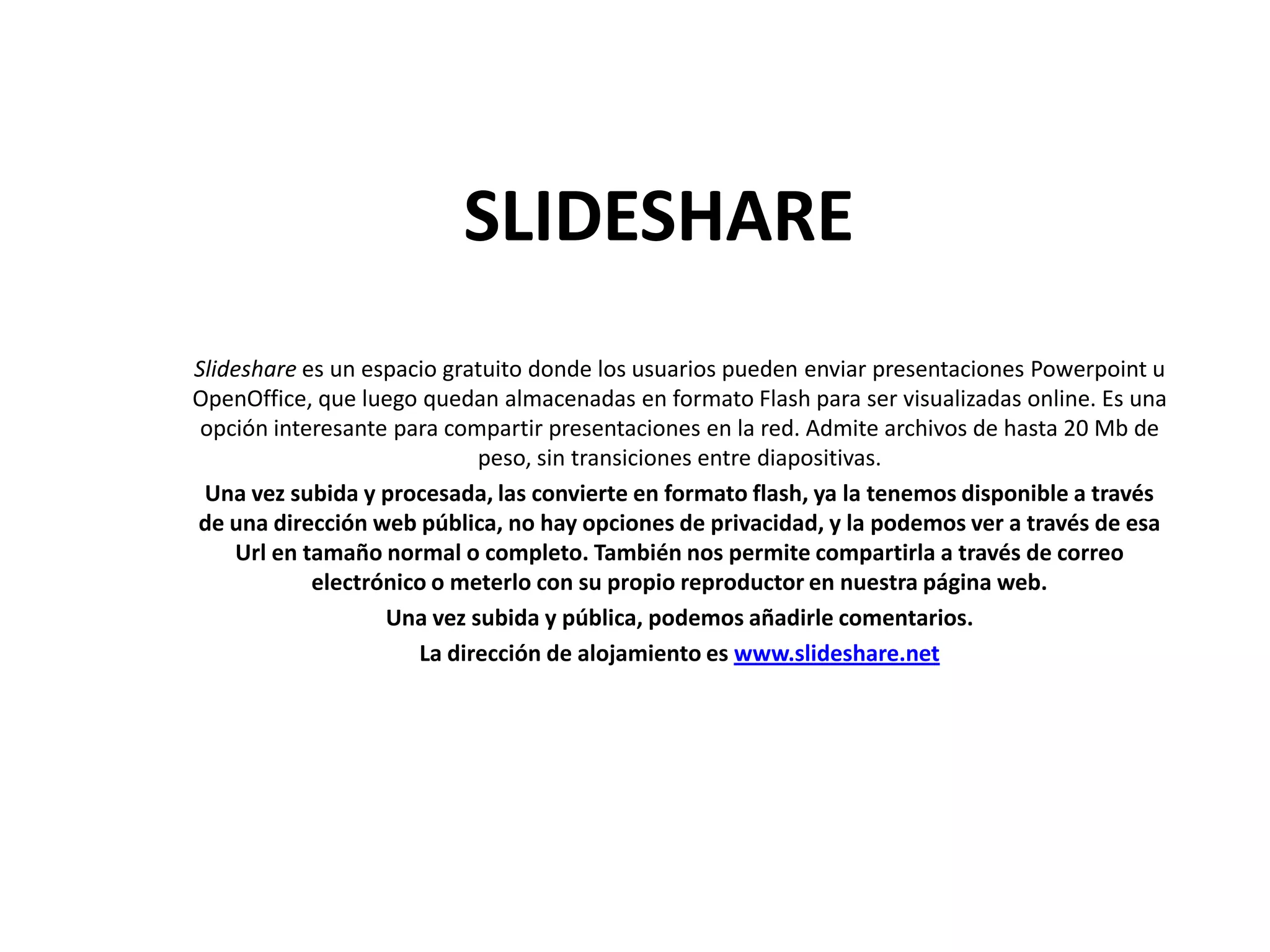 Slideshare es un sitio web gratuito donde los usuarios pueden subir presentaciones en formato PowerPoint o OpenOffice para ser visualizadas en línea en formato Flash. Una vez subida, la presentación se convierte a formato Flash y queda disponible a través de una dirección URL pública, permitiendo compartirla a través de correo electrónico o en páginas web. Los usuarios también pueden añadir comentarios a las presentaciones subidas.