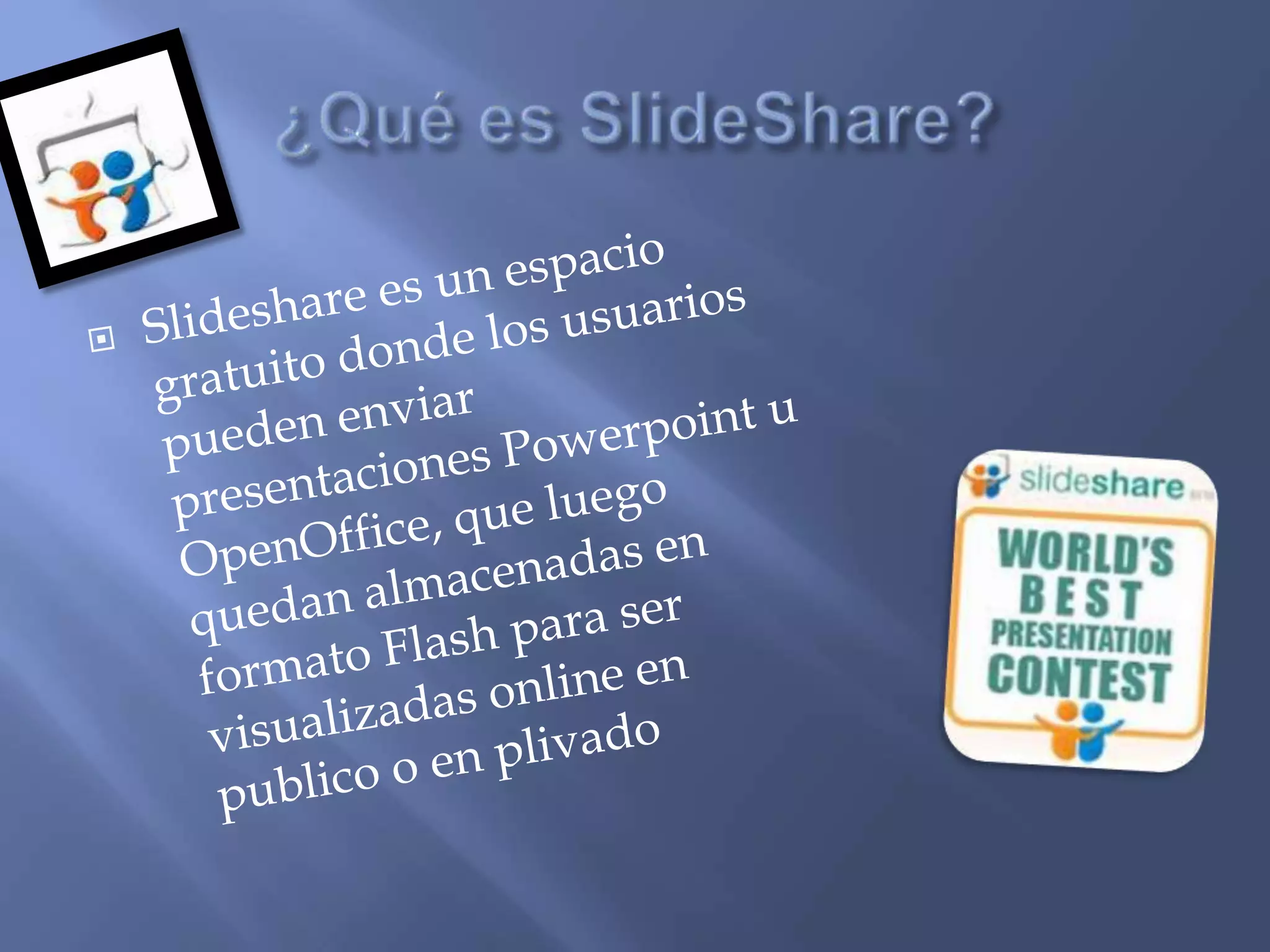 SlideShare es una plataforma para compartir presentaciones en línea. Los usuarios pueden subir presentaciones en formatos como PowerPoint, crear cuentas de usuario gratuitas, y configurar la privacidad y metadatos de sus presentaciones. Las presentaciones se convierten a formato Flash y se comparten a través de enlaces públicos. Los usuarios también pueden incrustar presentaciones en blogs u otros sitios web.
