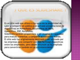 Slideshare es un sitio web que permite a los usuarios subir y compartir presentaciones, documentos y otros archivos. Los usuarios pueden ver, comentar y compartir el contenido subido. Slideshare fue lanzado en 2006 y adquirido por LinkedIn en 2012. Se ha convertido en una herramienta útil para compartir contenidos profesionales.