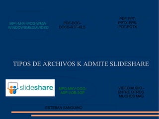 SlideShare es un sitio web que permite a los usuarios publicar, archivar y compartir presentaciones en formatos como PowerPoint y OpenOffice mediante archivos de hasta 20 MB en formatos como PDF, PPT, PPTX y videos. Los usuarios pueden visualizar las presentaciones subidas por otros en línea.