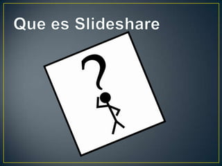 Slideshare es una plataforma que permite a los usuarios subir y compartir presentaciones, documentos, PDF y otros archivos. Los usuarios pueden ver y descargar los archivos de otros de manera pública o privada. Slideshare facilita el intercambio de conocimiento entre usuarios sobre una amplia variedad de temas.