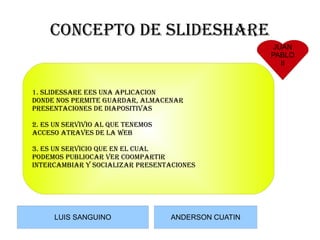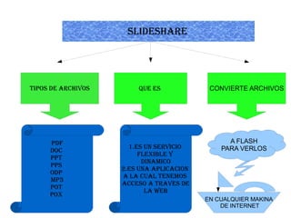 Este documento proporciona información sobre SlideShare, un servicio web que permite a los usuarios publicar, compartir y visualizar presentaciones. SlideShare permite a los usuarios almacenar presentaciones en línea, convertir archivos a formato Flash para verlos en cualquier dispositivo con acceso a Internet, y crear cuentas para subir y compartir archivos.