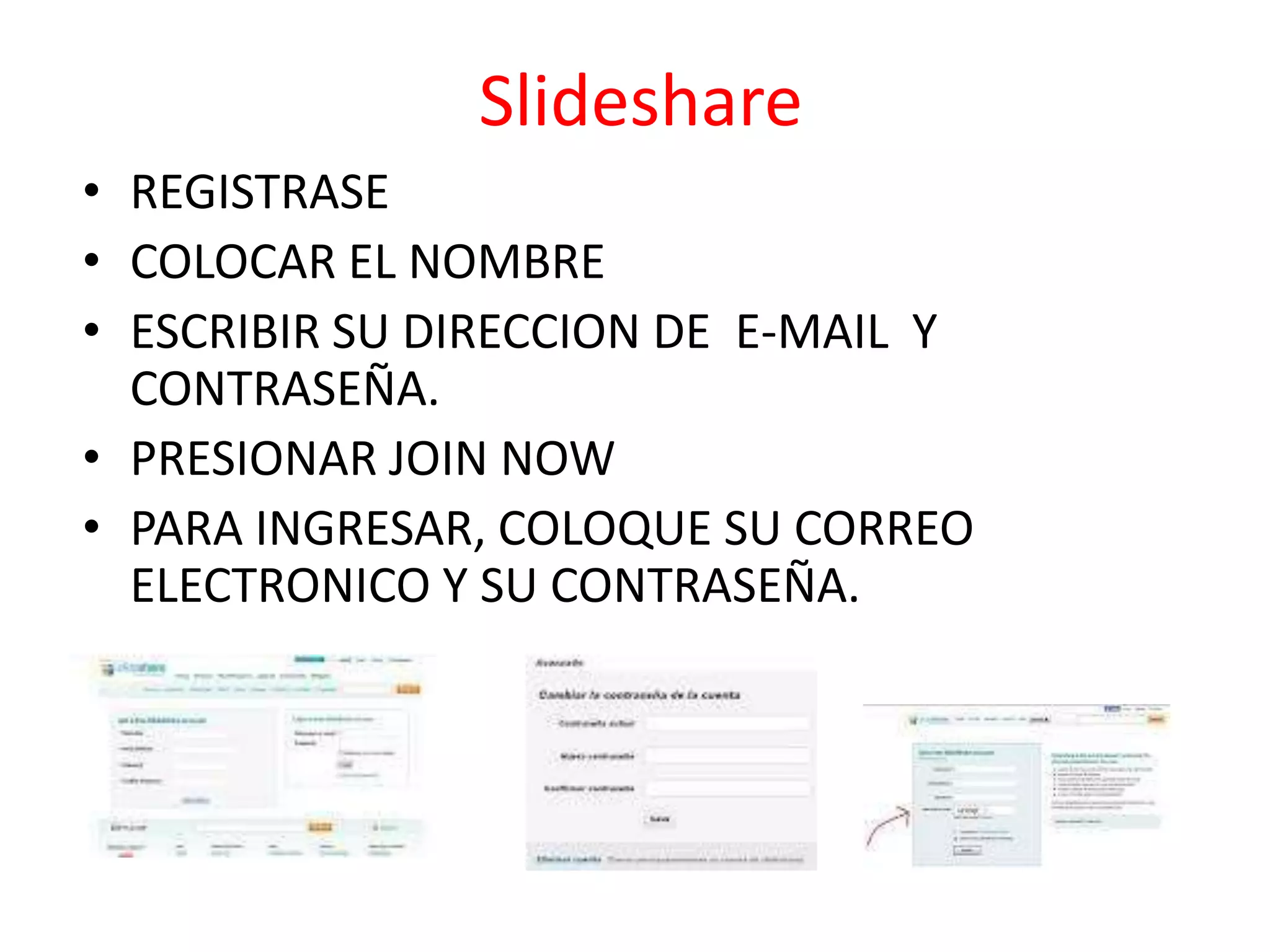 Para registrarse en Slideshare, el usuario debe proporcionar su nombre, dirección de correo electrónico y contraseña al hacer clic en "Join Now". Luego, para ingresar a su cuenta, debe introducir su correo electrónico y contraseña.