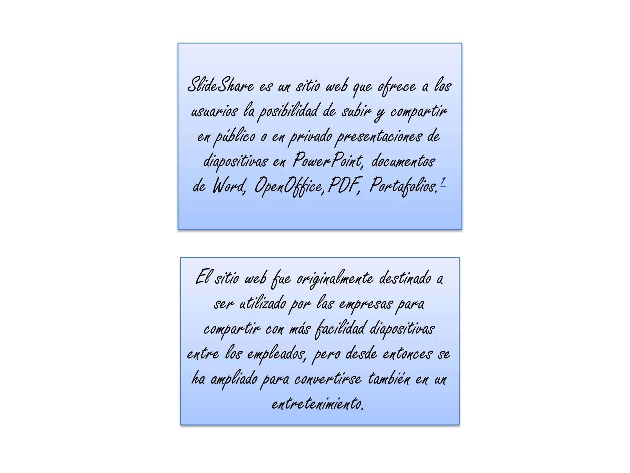 SlideShare es un sitio web que permite a los usuarios subir y compartir presentaciones de diapositivas, documentos y otros archivos. Los usuarios pueden compartir archivos de forma pública o privada. SlideShare fue adquirido por LinkedIn en 2012 y ofrece servicios como la capacidad de agregar audio a las presentaciones.