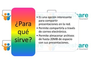 SlideShare es una aplicación web que permite almacenar y compartir presentaciones de diapositivas de hasta 20MB de espacio, convirtiendo las presentaciones en formato flash para que puedan verse desde cualquier máquina con acceso a Internet. Fue creada en 2006 en Estados Unidos y ofrece funciones como añadir comentarios, realizar búsquedas de presentaciones compartidas y compartir las presentaciones a través de correo electrónico.