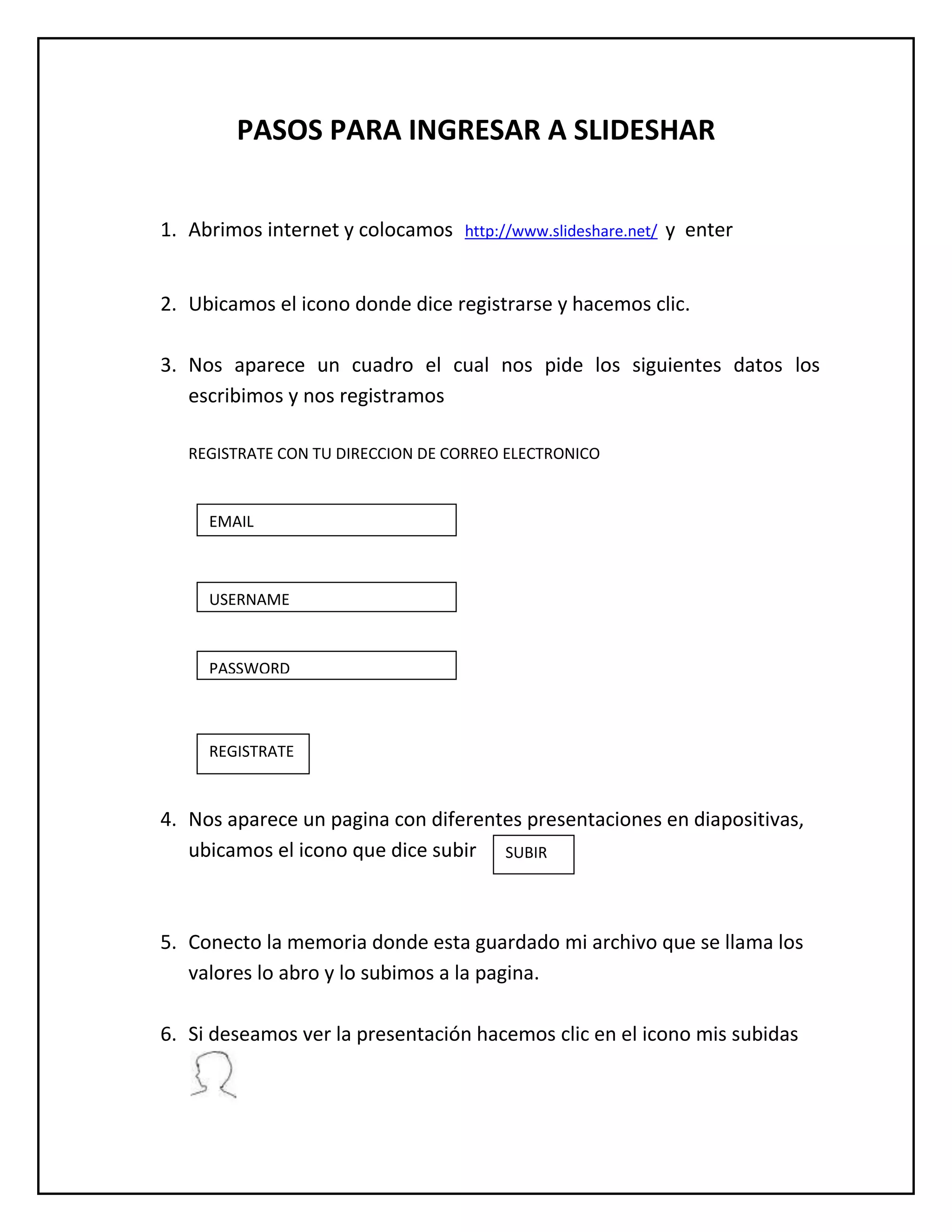 El documento proporciona instrucciones en 5 pasos para registrarse e ingresar presentaciones en SlideShare, comenzando con abrir la página web de SlideShare, hacer clic en el icono de registro e ingresar la dirección de correo electrónico, nombre de usuario y contraseña, luego cargar presentaciones al hacer clic en el icono de subir y seleccionar los archivos desde una memoria USB.
