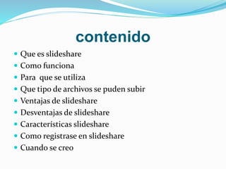 SlideShare es un sitio web que permite a los usuarios subir y compartir presentaciones de diapositivas de manera pública o privada. Los usuarios pueden registrarse gratuitamente para crear un espacio donde almacenar presentaciones en formatos como PowerPoint, que luego son convertidas a flash para verlas en línea. SlideShare fue lanzado en 2006 y adquirido por LinkedIn en 2012.