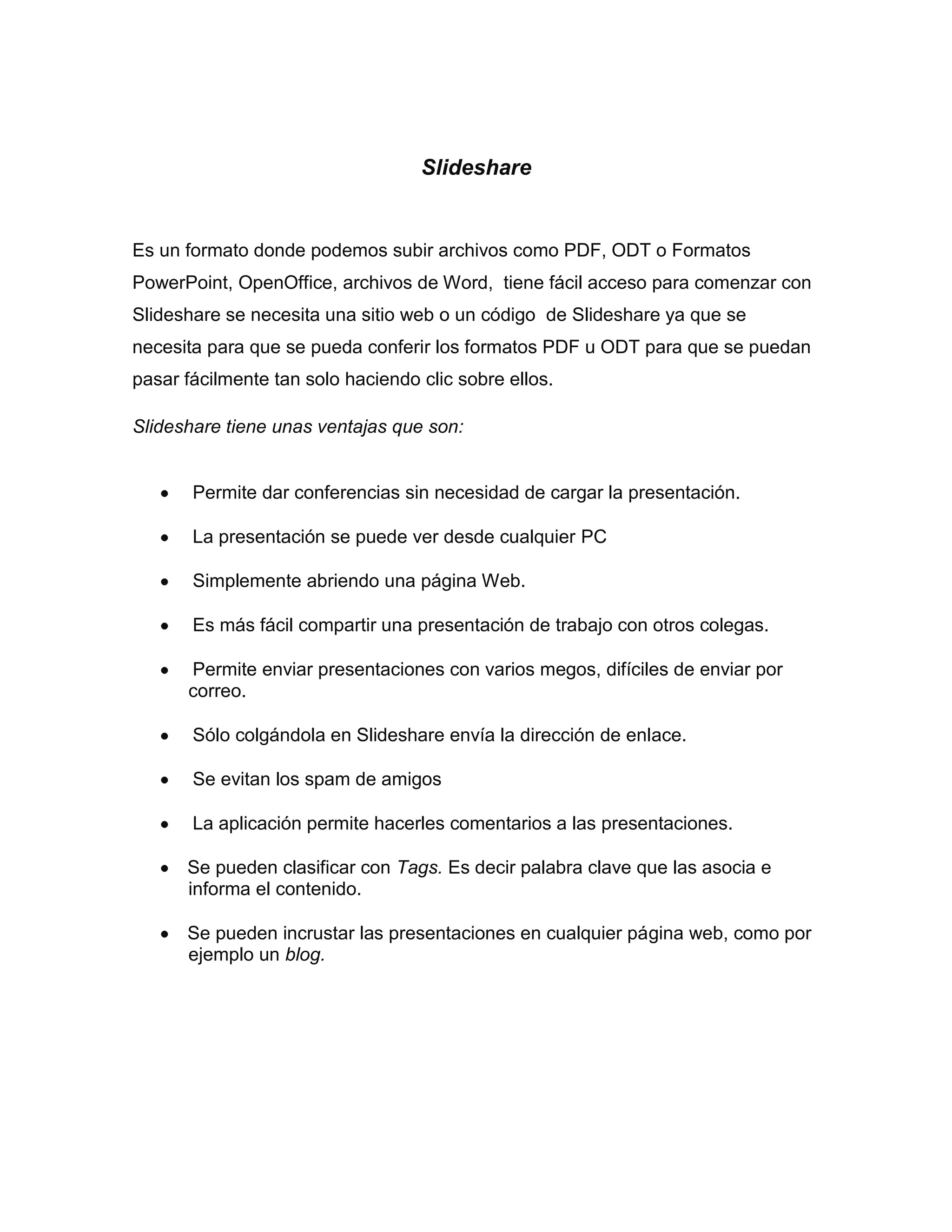 Slideshare es una plataforma que permite subir presentaciones en formatos como PDF, PowerPoint y Word para compartirlas en línea. Ofrece ventajas como permitir dar conferencias sin necesidad de cargar la presentación, compartir archivos grandes fácilmente y clasificar las presentaciones con etiquetas. También tiene desventajas como que las presentaciones son estáticas y no admiten animaciones o sonido. Slideshare es útil tanto para maestros como estudiantes, ya que los maestros pueden explicar temas en línea y los estudiantes compartir trabajos para que otros ob