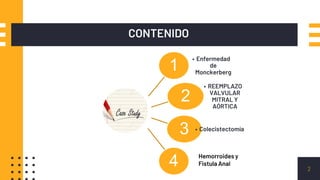 El documento presenta el caso clínico de un paciente masculino de 56 años con diagnóstico de diabetes mellitus tipo 2, pie diabético y antecedentes de amputaciones. Se detallan los exámenes realizados incluyendo angioplastia, radiografía de tórax y análisis de laboratorio. El resumen describe la enfermedad arterial oclusiva, la técnica de amputación supracondílea femoral realizada y las posibles complicaciones de la misma.