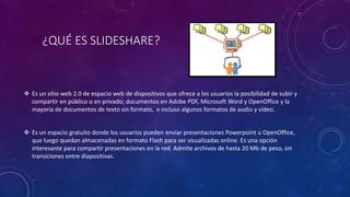 Este documento explica cómo usar el sitio web SlideShare para crear una cuenta, subir presentaciones y documentos, y buscar contenido. Primero describe brevemente qué es SlideShare, luego detalla los pasos para crear una cuenta, subir archivos y buscar presentaciones cargadas por otros usuarios.