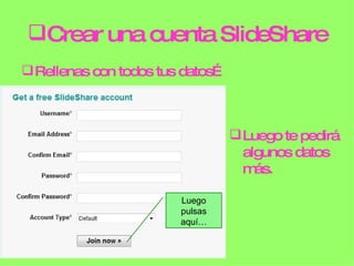 Crear una cuenta en SlideShare, rellenar los datos requeridos, y luego cargar presentaciones seleccionándolas desde el dispositivo y eligiéndolas en la plataforma.