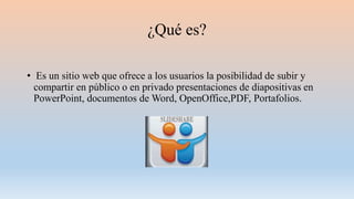 SlideShare es un sitio web que permite a los usuarios subir y compartir presentaciones de PowerPoint, documentos de Word, PDF y otros formatos. Los usuarios pueden almacenar y compartir contenidos sin adjuntar archivos pesados por correo, realizar búsquedas de presentaciones, añadir comentarios y compartir enlaces. Para subir un archivo, los usuarios deben crear una cuenta, seleccionar el archivo y cargarlo en la página web.