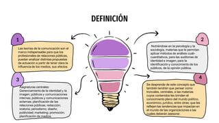 Este documento define las relaciones públicas y describe las funciones de los profesionales de relaciones públicas. Explica que los profesionales de relaciones públicas manejan la identidad y la imagen de una organización, planifican las comunicaciones internas y externas, y establecen relaciones con los medios, la comunidad, consumidores, empleados y grupos de interés para construir y conservar una imagen positiva que beneficie a la organización. También destaca que los profesionales de relaciones públicas asesoran a los niveles gerenciales en estrategia