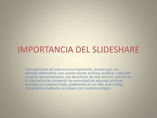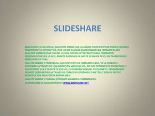 SlideShare es un sitio web gratuito donde los usuarios pueden subir presentaciones en formato PowerPoint o OpenOffice para que sean almacenadas y vistas en línea en formato Flash. Los usuarios pueden compartir las presentaciones a través de correo electrónico o incluirlas en su página web. SlideShare también permite añadir comentarios a las presentaciones una vez subidas y publicadas.