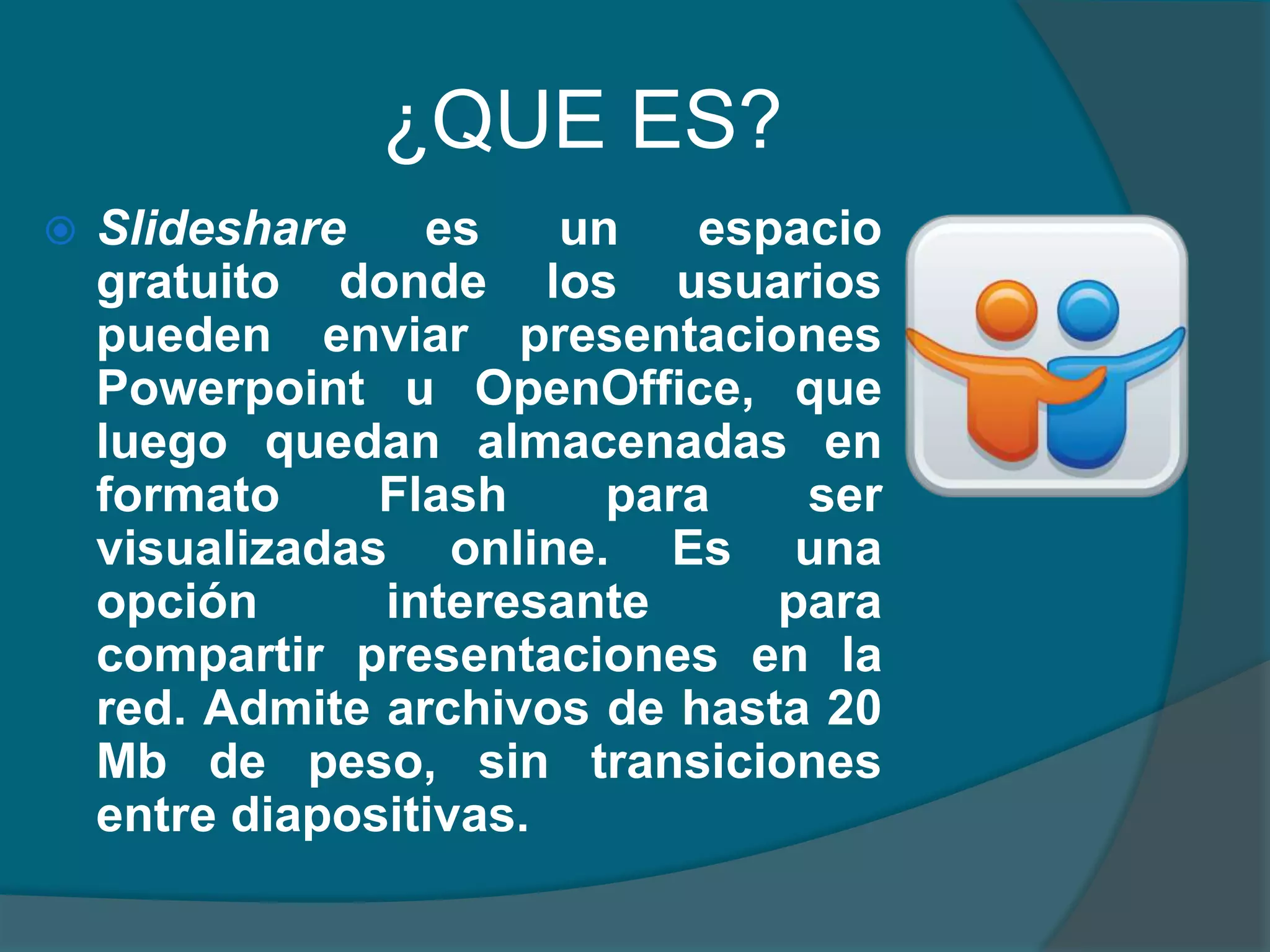 Slideshare es un sitio web gratuito donde los usuarios pueden publicar presentaciones de PowerPoint u OpenOffice para compartirlas en línea. Los usuarios pueden crear una cuenta en slideshare.net proporcionando un nombre de usuario, correo electrónico y contraseña. Una vez creada la cuenta, los usuarios pueden publicar presentaciones, acceder a las presentaciones de otros usuarios, y recibir comentarios sobre sus propias presentaciones publicadas.