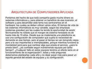 El documento aborda la importancia de la actualización de sistemas informáticos en las empresas, destacando que muchos sistemas antiguos se mantienen en uso ilegítimamente, lo que puede afectar el rendimiento y la eficiencia laboral. Se discuten problemas relacionados con computadoras obsoletas y su impacto en la distracción de los empleados, así como la necesidad de considerar la arquitectura de computadores al realizar actualizaciones. Se proponen diferentes enfoques para la toma de decisiones sobre la modernización de equipos tecnológicos, desde un enfoque unilateral hasta uno colaborativo.