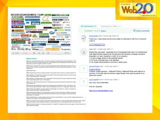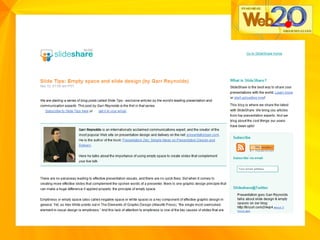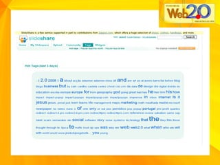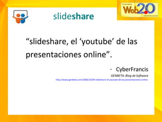 SlideShare es un servicio gratuito de hospedaje de presentaciones en línea, lanzado en octubre de 2006, que permite a los usuarios compartir y visualizar presentaciones de diversas temáticas 24/7. Ofrece ventajas como la indexación de contenido por Google, integración de audio y opciones de embebido, pero presenta desventajas como la incapacidad de modificar presentaciones una vez subidas y limitaciones en el tamaño del archivo. Se propone su uso en bibliotecas por su capacidad de facilitar la colaboración y el aprendizaje a través de la compartición del conocimiento.