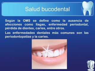 Este documento trata sobre la salud bucodental. Explica que las enfermedades dentales más comunes son la caries y las enfermedades periodontales, y que entre un 60%-90% de los escolares padecen caries. Recomienda prevenir estas enfermedades reduciendo el consumo de dulces y manteniendo una buena higiene dental como cepillarse los dientes dos veces al día.