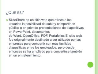 SlideShare es un sitio web que permite a los usuarios subir y compartir presentaciones de diapositivas, documentos de Word y PDF. Los archivos cargados se almacenan en formato flash y se genera un código HTML que permite compartirlos fácilmente en redes sociales. A diferencia de sitios como Slideboom y Scribd, SlideShare se enfoca específicamente en la distribución de presentaciones de diapositivas.