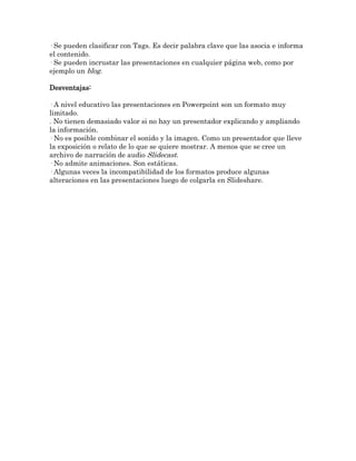 Slideshare es un sitio web gratuito donde los usuarios pueden publicar presentaciones en formato flash para compartirlas en línea. Las presentaciones se pueden ver desde cualquier computadora a través de un enlace sin necesidad de adjuntar archivos pesados. Esto permite compartir fácilmente presentaciones con otros y enviarlas a estudiantes. Algunas ventajas educativas incluyen dar conferencias sin cargar la presentación, recibir comentarios, y clasificar presentaciones con etiquetas. Las desventajas son que el formato PowerPoint es limitado sin un presentador, y las