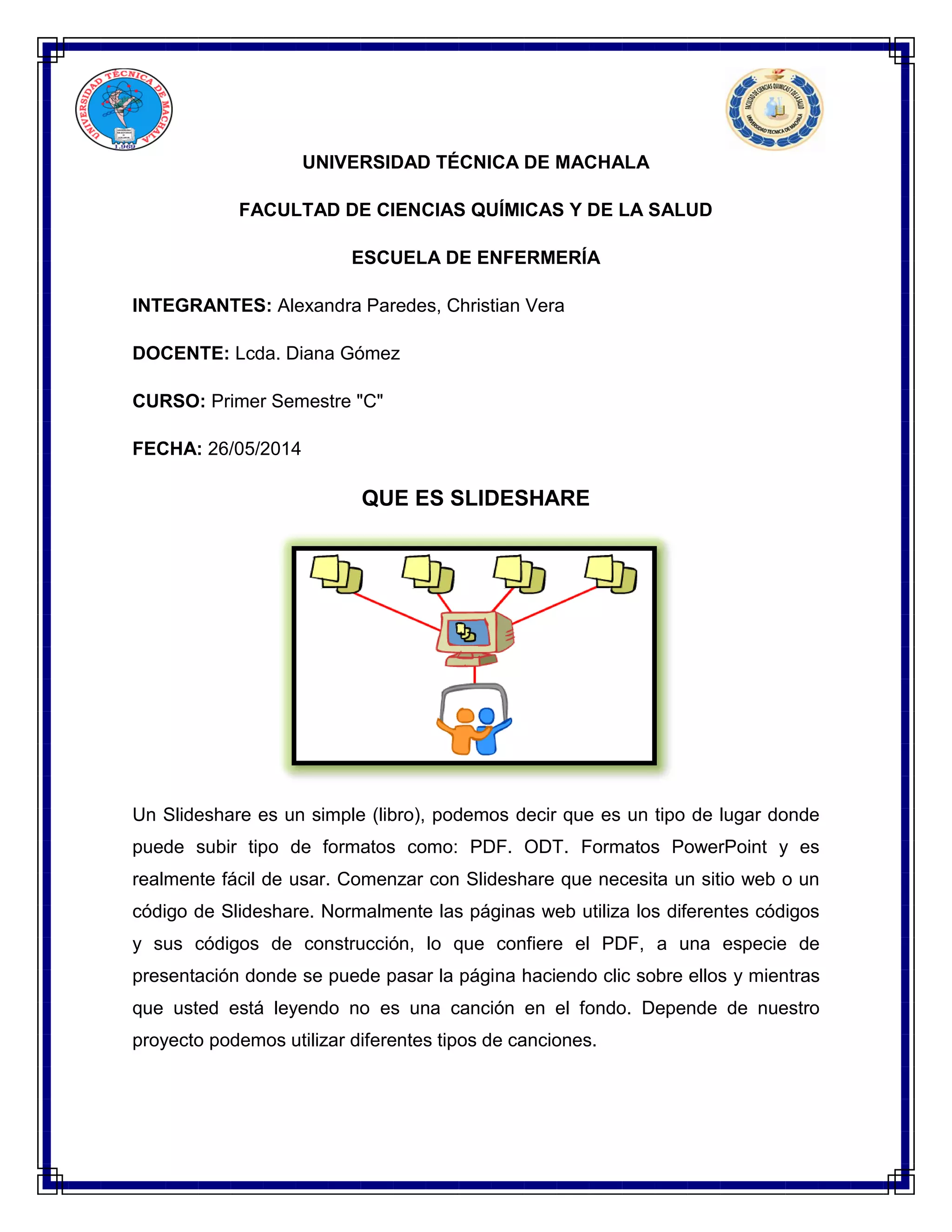 UNIVERSIDAD TÉCNICA DEMACHALA FACULTAD DE CIENCIAS QUÍMICAS Y DE LA SALUD ESCUELA DE ENFERMERÍA INTEGRANTES: Alexandra Paredes, Christian Vera DOCENTE: Lcda. Diana Gómez CURSO: Primer Semestre "C" FECHA: 26/05/2014 QUE ES SLIDESHARE Un Slideshare es un simple (libro), podemos decir que es un tipo de lugar donde puede subir tipo de formatos como: PDF. ODT. Formatos PowerPoint y es realmente fácil de usar. Comenzar con Slideshare que necesita un sitio web o un código de Slideshare. Normalmente las páginas web utiliza los diferentes códigos y sus códigos de construcción, lo que confiere el PDF, a una especie de presentación donde se puede pasar la página haciendo clic sobre ellos y mientras que usted está leyendo no es una canción en el fondo. Depende de nuestro proyecto podemos utilizar diferentes tipos de canciones.