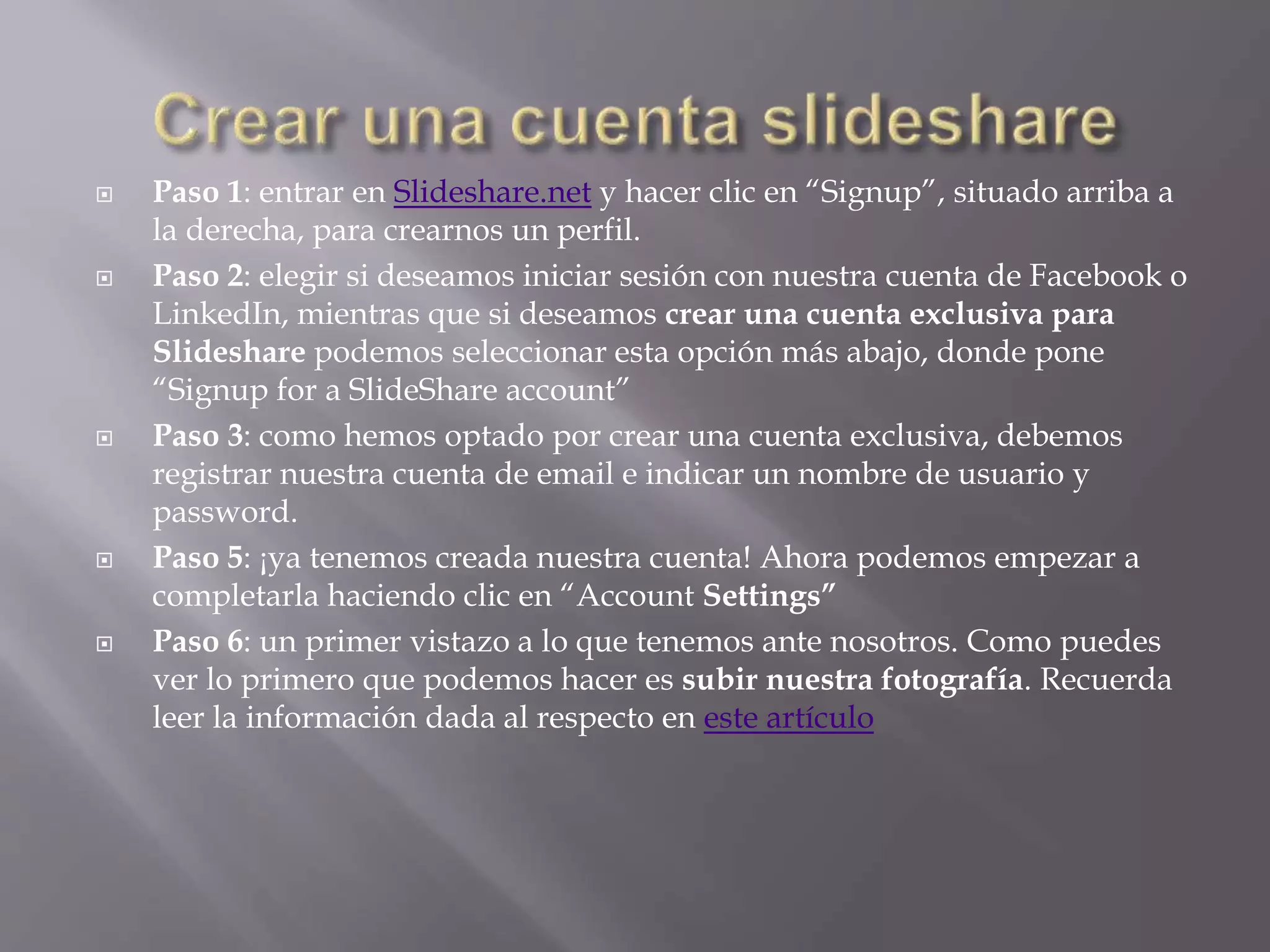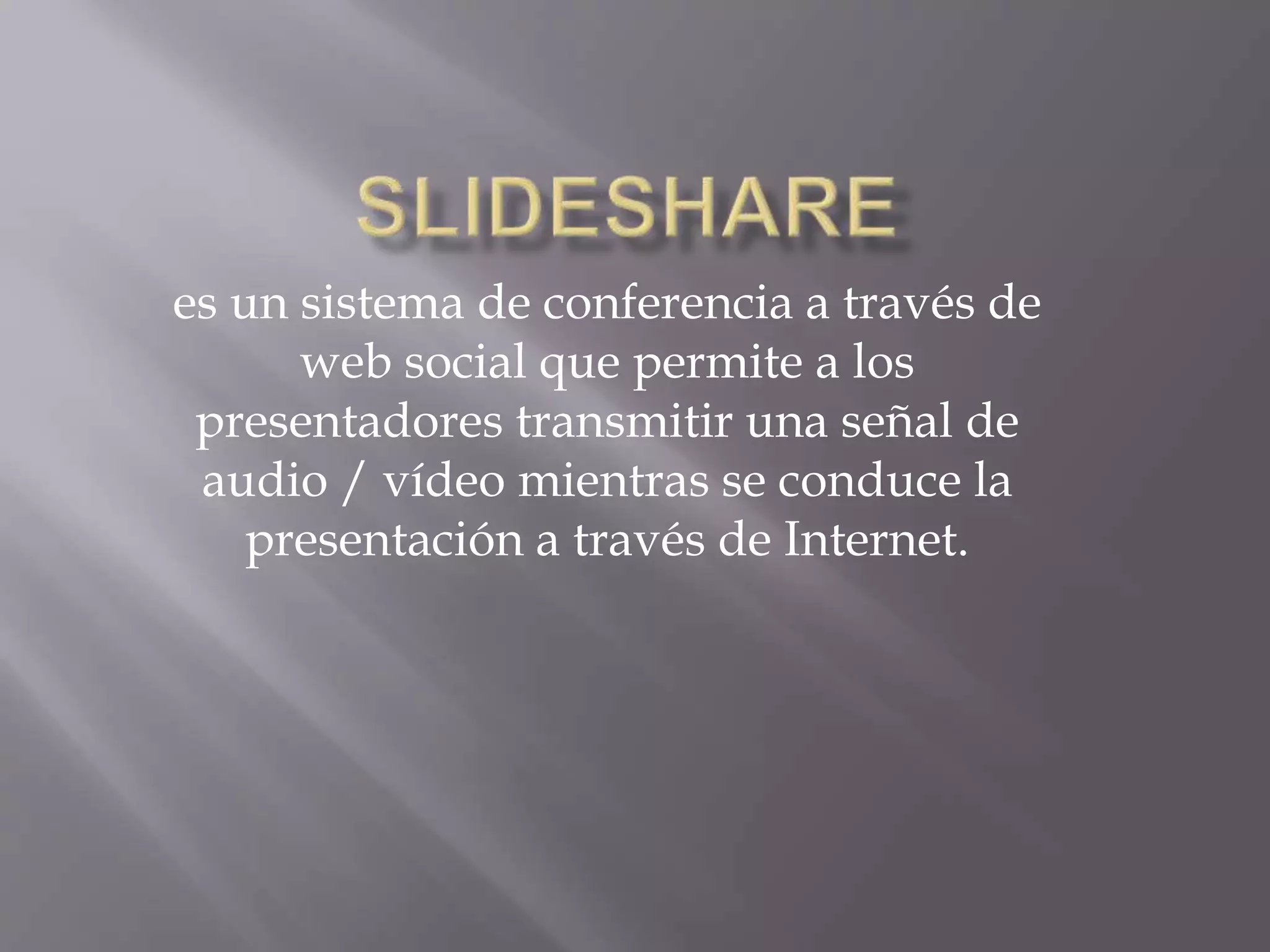 SlideShare es un sistema de conferencia a través de web social que permite a los presentadores transmitir una señal de audio/video mientras conducen una presentación a través de Internet. Los usuarios pueden crear una cuenta, subir presentaciones, descargar presentaciones de otros usuarios y agregar comentarios a las presentaciones de otros.