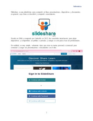 Slideshare es una plataforma para compartir presentaciones y documentos en línea. Los usuarios pueden crear una cuenta gratuita para cargar archivos en formatos como PDF, PowerPoint y Word y compartirlos públicamente o privadamente. Una vez cargados, los usuarios pueden ver estadísticas como número de vistas, me gusta y comentarios. Slideshare permite almacenar y compartir contenido de manera fácil y rápida.