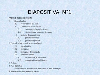 Este documento presenta información sobre redes locales. Explica conceptos básicos como las ventajas de las redes locales como aumentar la productividad y reducir costos. También describe los gestores de red como el gestor de archivos y el gestor de impresión. Además, cubre temas como los protocolos de control de comunicaciones en la red, incluyendo protocolos de contienda y métodos como polling y paso de testigo. Por último, menciona las normas estándares para redes locales.