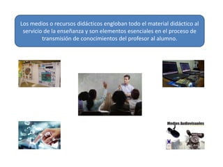 Los medios didácticos incluyen todo el material utilizado para transmitir conocimientos del profesor al alumno y se clasifican en materiales convencionales, audiovisuales y nuevas tecnologías. Deben ser útiles para apoyar el aprendizaje sin reemplazar al profesor y deben seleccionarse de forma racional.