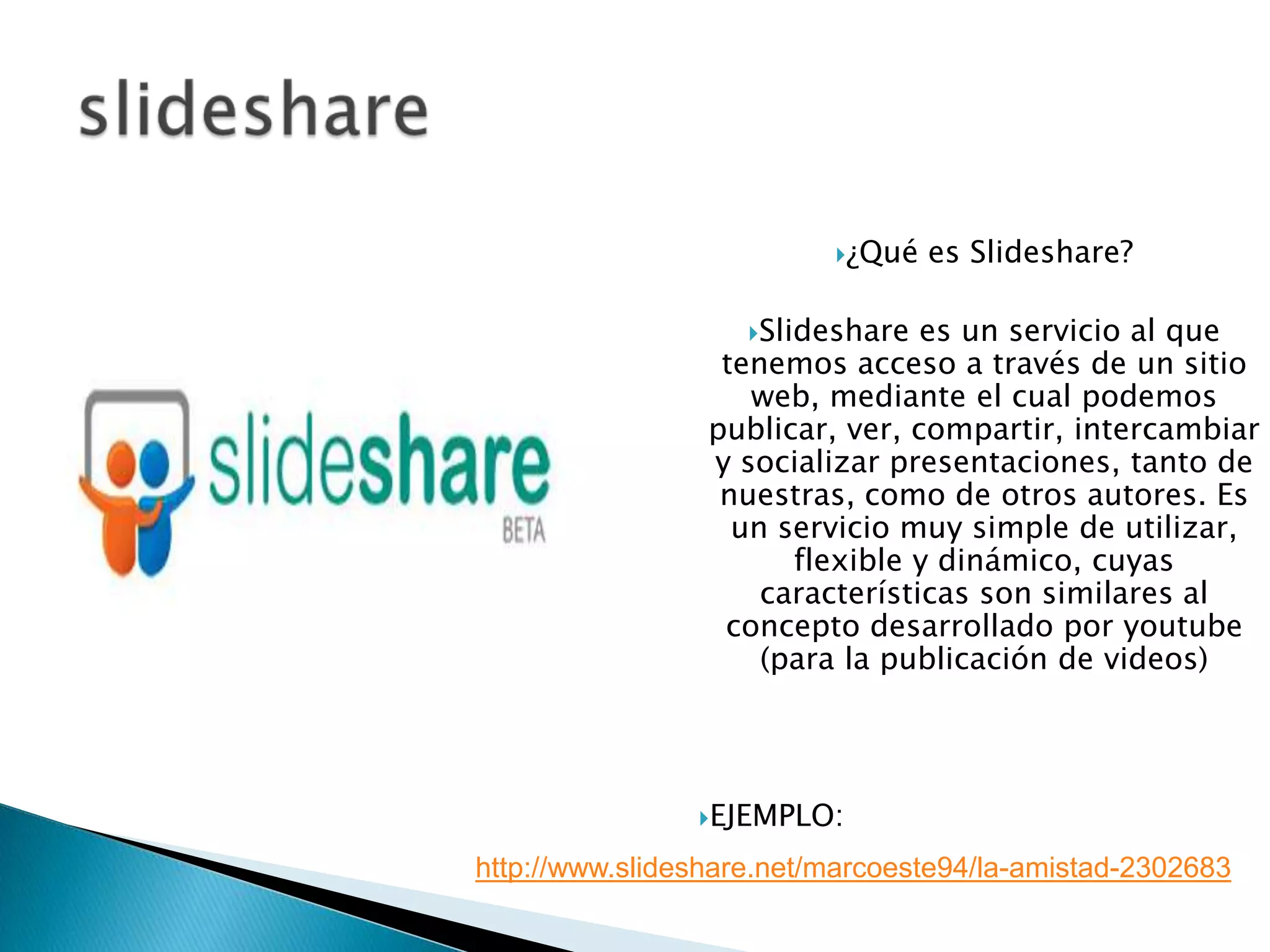 Slideshare es un servicio web para publicar, ver y compartir presentaciones. Bebo es una red social para compartir fotos, videos y conectarse con amigos. Blogger permite crear blogs personales. Hot Potatoes crea ejercicios educativos como respuestas cortas y emparejamientos. CmapTools crea mapas conceptuales. Scribd permite publicar y compartir documentos. Smart Board graba presentaciones interactivas. Facebook es una red social para conectarse con amigos y conocidos. Sonic es una red social latinoamericana para interactuar socialmente.