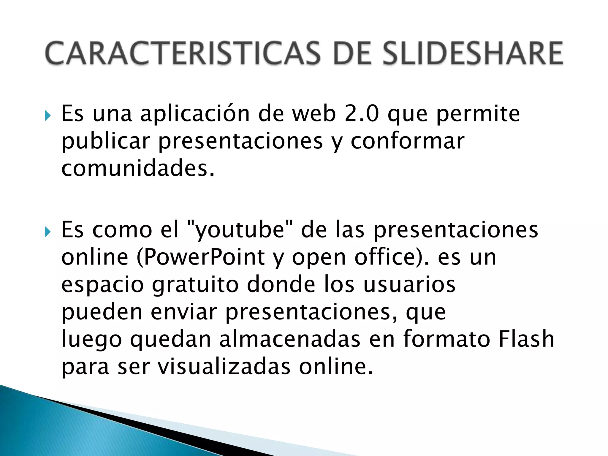 SlideShare es una plataforma web que permite a los usuarios publicar y compartir presentaciones en formato Flash de manera gratuita. Los usuarios pueden subir presentaciones de hasta 20 MB, añadir etiquetas y permitir que otros usuarios las vean, comenten y descarguen sin restricciones de privacidad. SlideShare se usa comúnmente para compartir material educativo y presentaciones de trabajo.