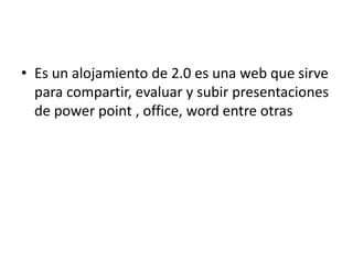 SlideShare es una plataforma creada en 2006 que permite a los usuarios compartir y publicar presentaciones de PowerPoint, documentos y otros archivos de manera privada o pública con el objetivo de elevar el conocimiento. Los usuarios pueden subir sus presentaciones para que otras personas puedan verlas desde cualquier computadora sin necesidad de descargar archivos.