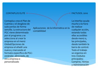 Este documento describe tres programas de software contable: ERP-software que automatiza los procesos empresariales y ayuda a controlar inventario y flujos de trabajo; ZFactura que permite configurar facturas y presupuestos para empresas de servicios; y Contaplus que facilita la creación del plan de cuentas y estructura de subcuentas de acuerdo con el formato especificado.