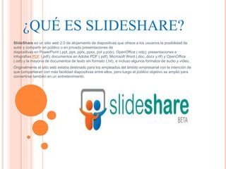 SlideShare es un sitio web que permite a los usuarios subir y compartir presentaciones de diapositivas. Originalmente estaba destinado a empleados para compartir presentaciones, pero ahora también se usa para entretenimiento. SlideShare permite administrar una cuenta para archivar, publicar y difundir presentaciones de una manera fácil sin adjuntar archivos pesados por correo. Proporciona ventajas como permitir dar conferencias sin la presentación física y compartir presentaciones con colegas de forma sencilla.