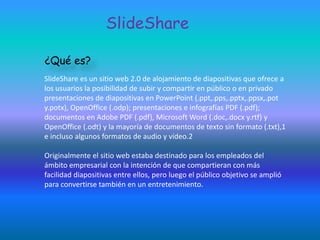 Este documento presenta SlideShare, un sitio web que permite a los usuarios subir y compartir presentaciones de diapositivas, documentos PDF y de texto. Explica los pasos para cargar archivos en SlideShare, que incluyen registrarse, seleccionar el archivo, agregar un título y descripción, y publicarlo. También describe cómo descargar archivos de SlideShare buscando un tema, seleccionando una presentación, y descargando e instalando el archivo.