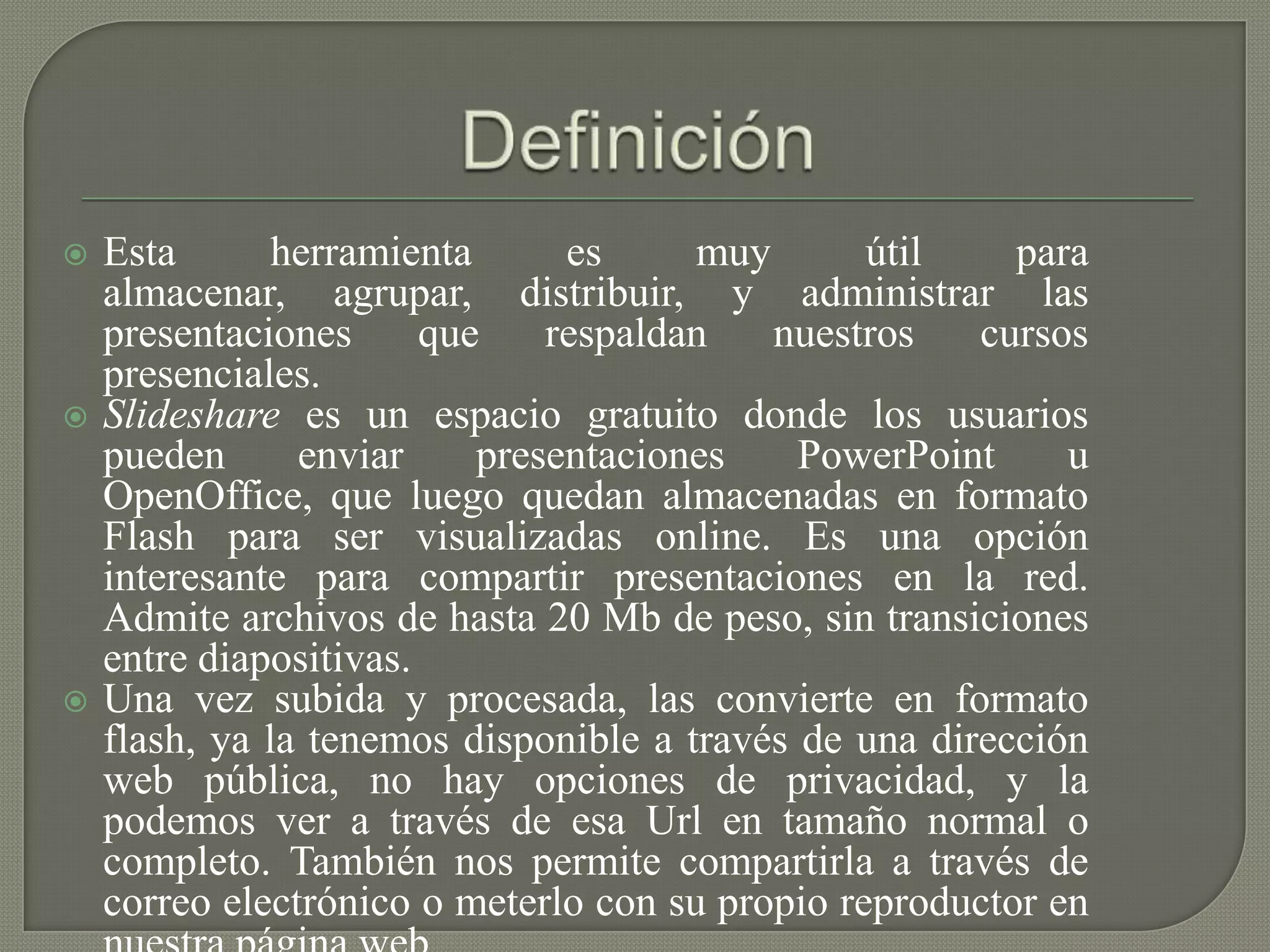 Slideshare es una herramienta gratuita para almacenar, organizar y compartir presentaciones en línea en formato Flash. Los usuarios pueden subir presentaciones de PowerPoint u OpenOffice de hasta 100 MB y acceder a ellas a través de una dirección URL pública. Una vez cargadas, las presentaciones se convierten a formato Flash para ser vistas en línea sin necesidad del programa original.