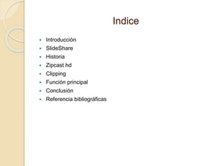 Este documento provee información sobre la plataforma SlideShare. Explica que SlideShare es un sitio web para compartir presentaciones de PowerPoint y otros formatos. Describe su historia, incluyendo que fue lanzado en 2006 y adquirido por LinkedIn en 2012. También resume funciones como Zipcasts para transmitir presentaciones en vivo y Clipping para guardar diapositivas individuales.