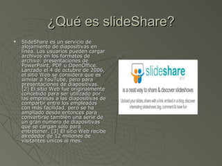 Slideshare es un servicio web que permite a los usuarios subir presentaciones en formato PowerPoint, PDF u OpenOffice de manera gratuita. Los usuarios pueden compartir las presentaciones a través de enlaces o insertarlas en blogs y páginas web. El servicio convierte las presentaciones a formato Flash para que puedan verse online. Slideshare sería útil para la educación porque permitiría a los profesores crear resúmenes interactivos de sus clases y compartirlos con los estudiantes, haciendo las lecciones más didácticas y participativas.