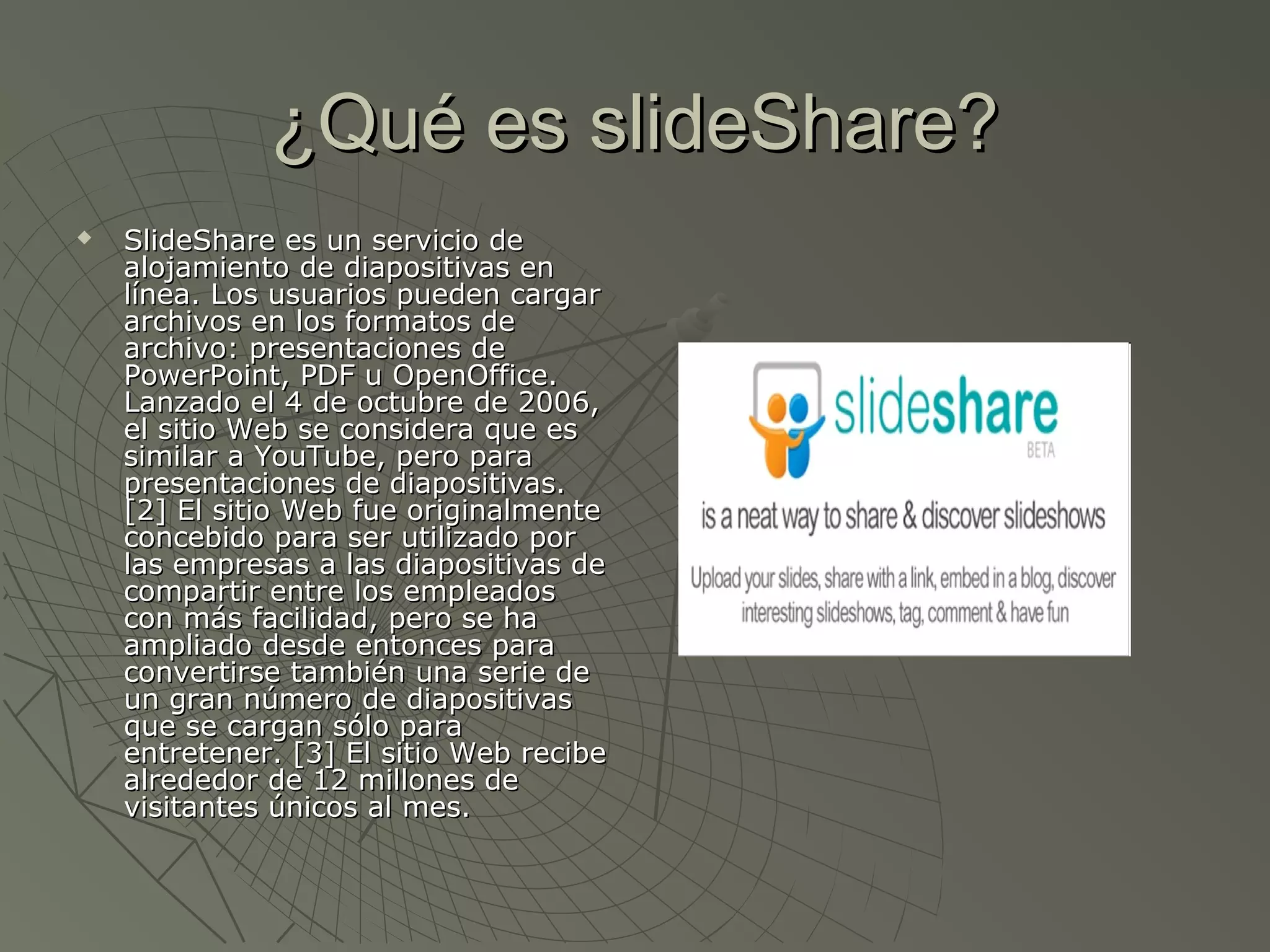 Slideshare es un servicio web que permite a los usuarios subir presentaciones en formato PowerPoint, PDF u OpenOffice de manera gratuita. Los usuarios pueden compartir las presentaciones a través de enlaces o insertarlas en blogs y páginas web. El servicio convierte las presentaciones a formato Flash para que puedan verse online. Slideshare sería útil para la educación porque permitiría a los profesores crear resúmenes interactivos de sus clases y compartirlos con los estudiantes de manera fácil, haciendo las lecciones más didácticas